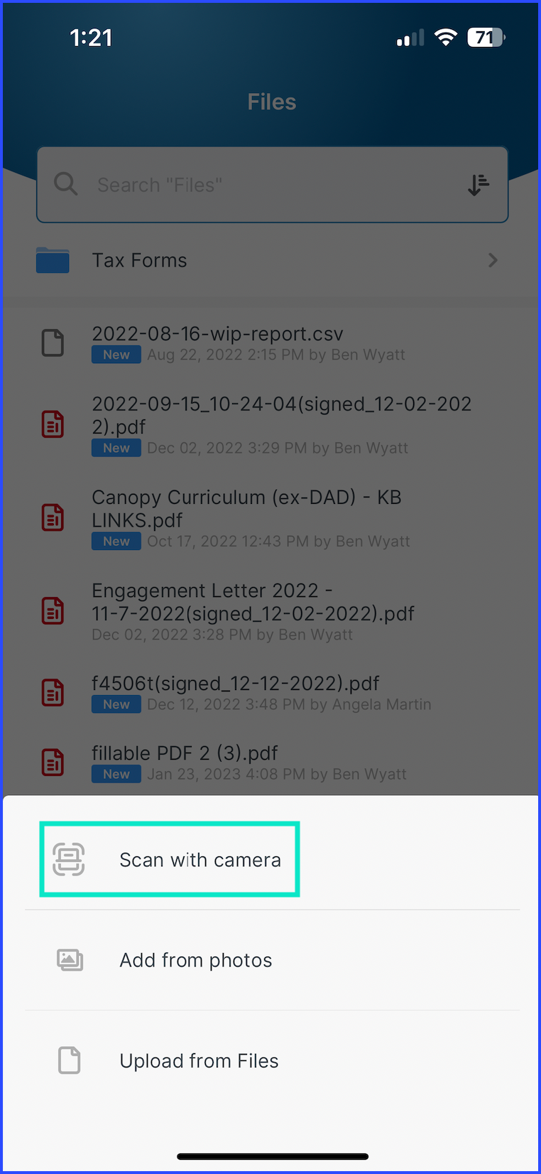 1. Click Add a file on the Files tab and tap Scan with camera.